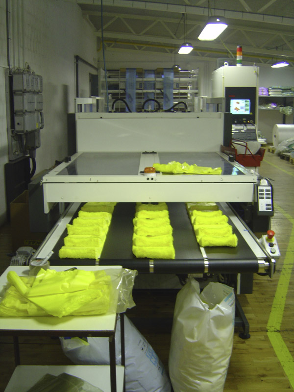 The aprons are made of HDPE and LDPE raw material, in shaded white colour and blocked finish, with a thickness of 25 um. It is possible to produce individual, coloured, printed finishes, if required.
